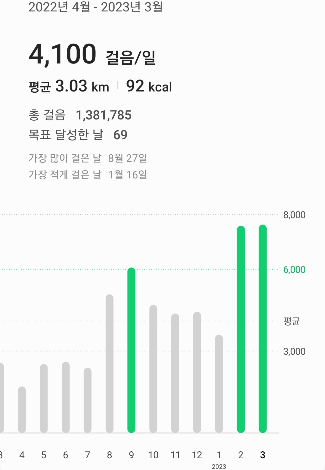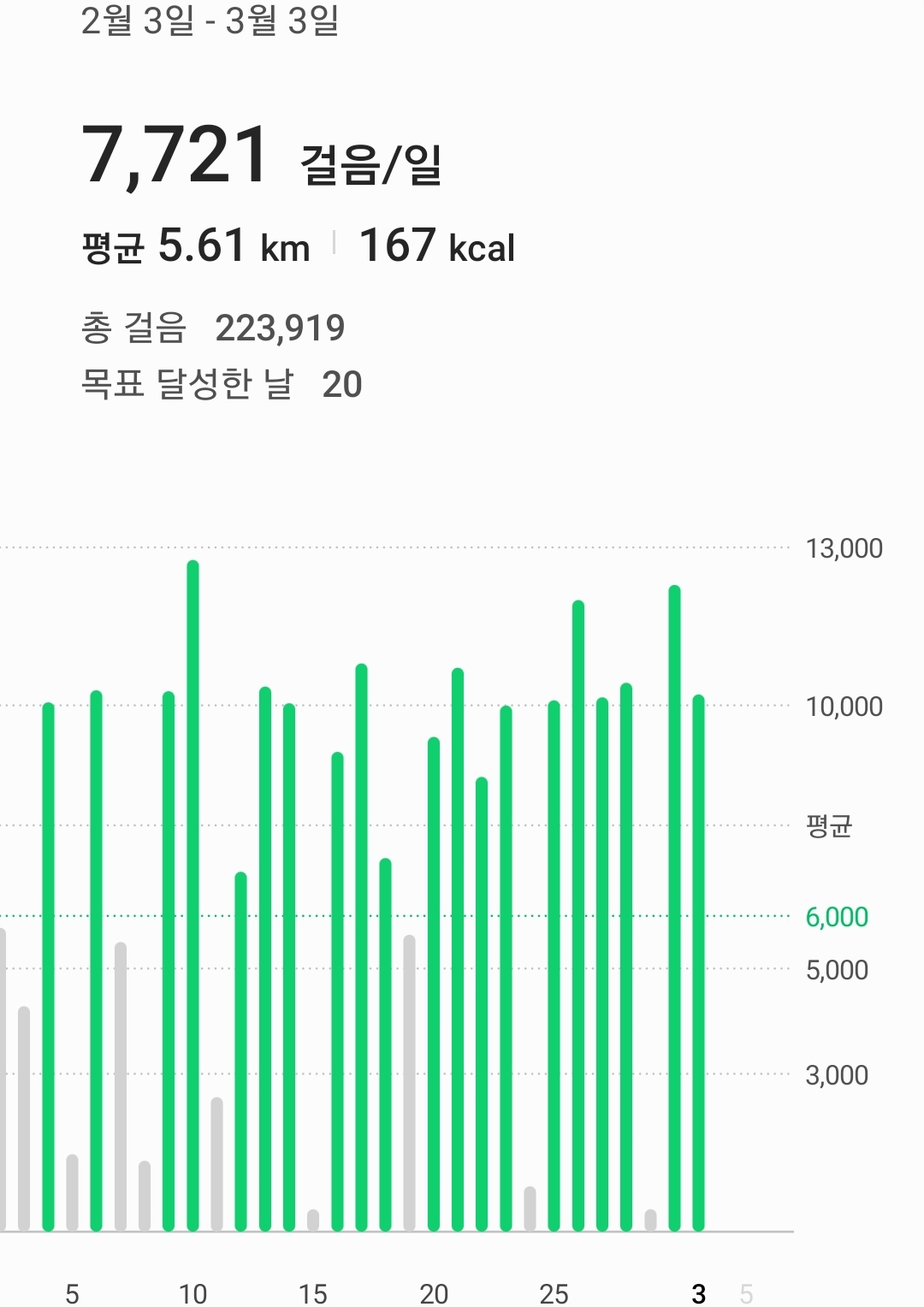 1000보로 시작해 점점 6000보를 목표로 걸었어요.